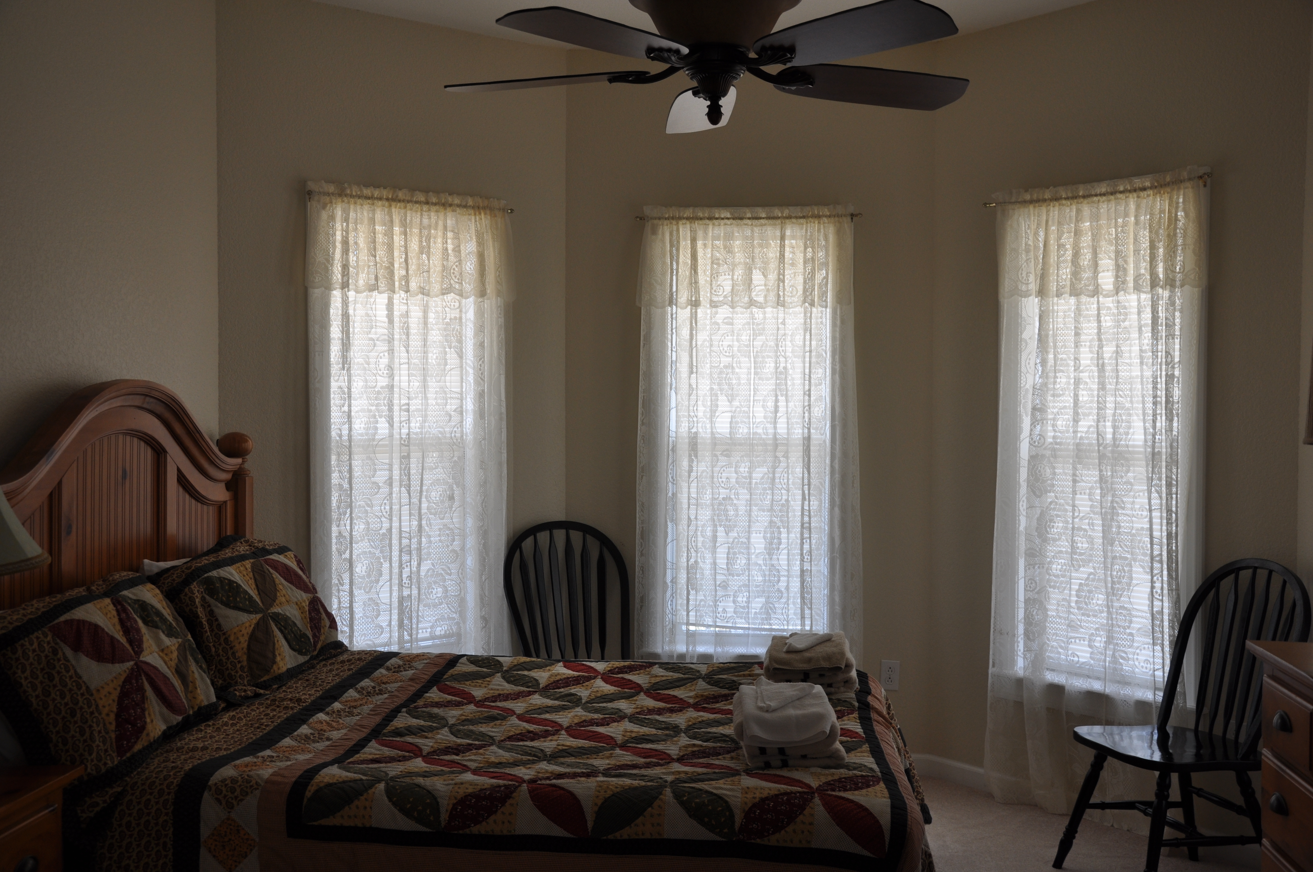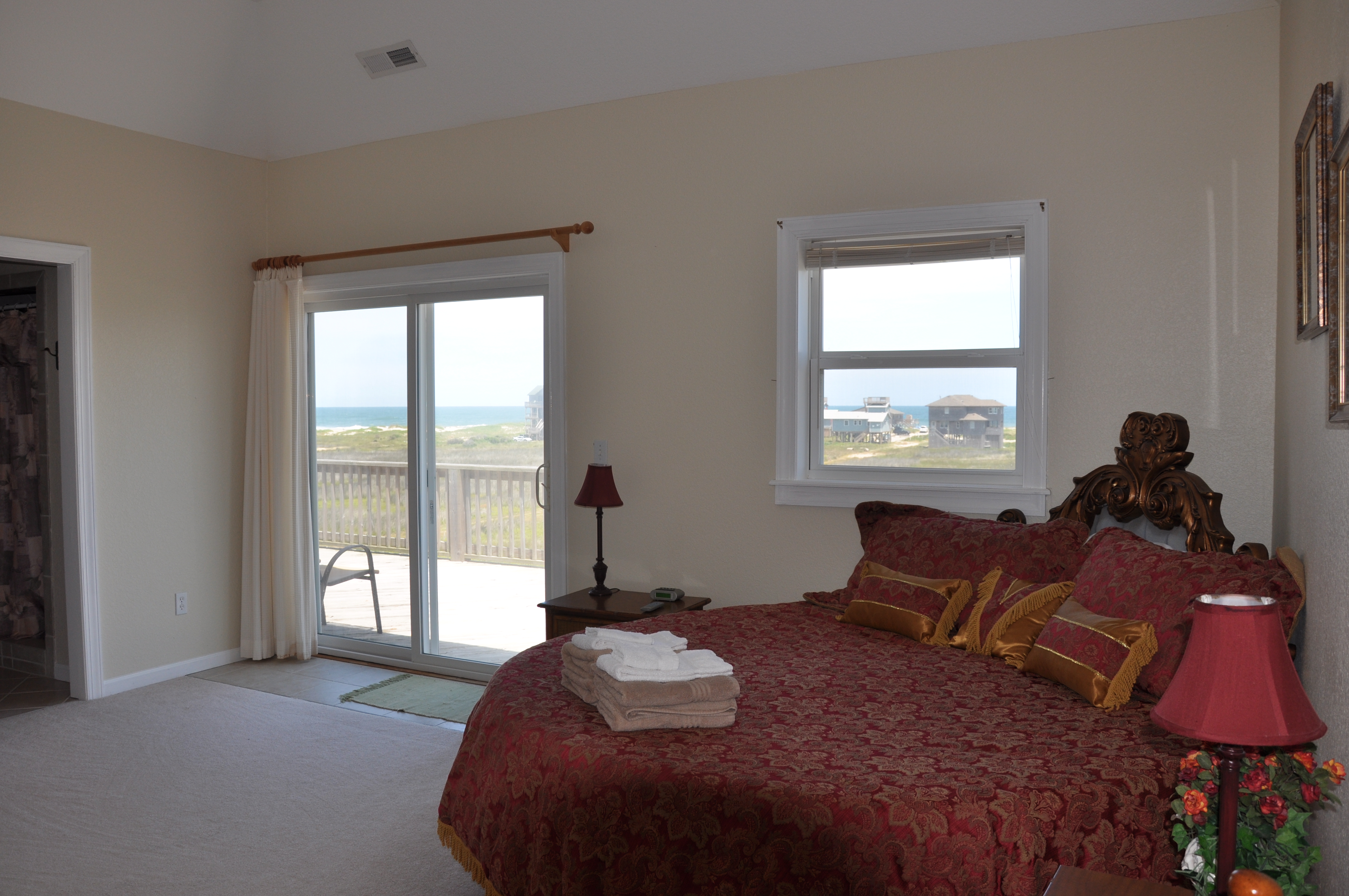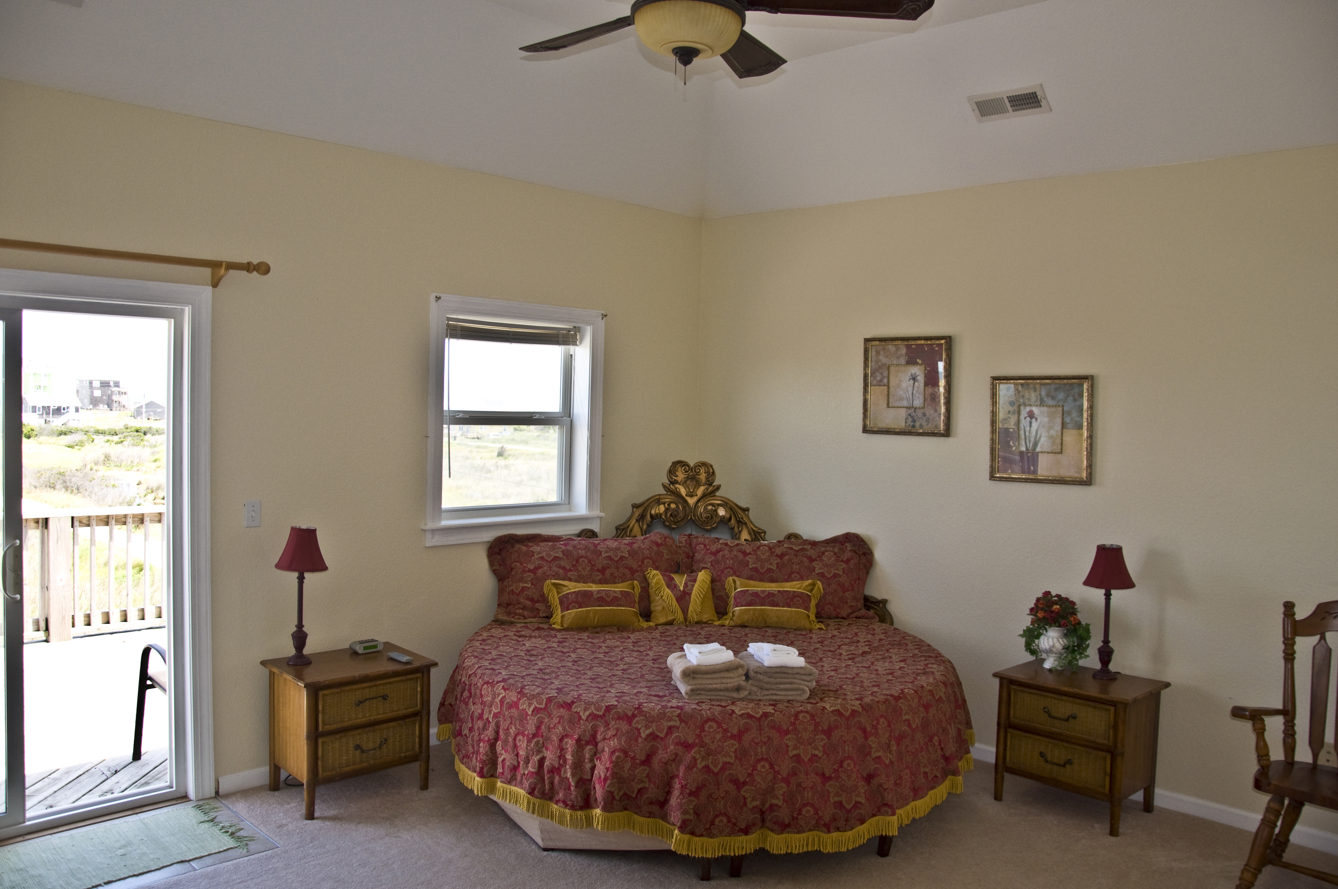 | The Castle has 5 bedrooms, each with a TV. Two bedrooms have king beds, 2 have queens and one has a queen and 2 twins. The master bedroom has its own 12x24 balcony with a hot tub. There are 3 bathrooms. We provide the linens and bath towels. There is also a washer and drier for your convenience. |